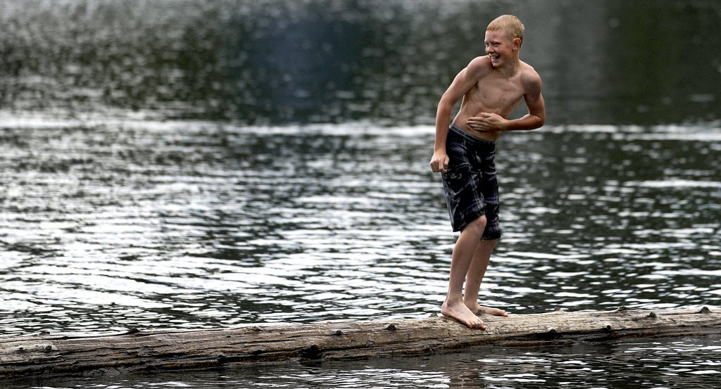 Twelve-year-old Kyler r Prendergast of Hayden did a balancing act as he walked on a log near the dike at Hayden Lake earlier today. Temperatures are expected to reach into the 90’s for the next few days. (Kathy Plonka’s SR photo)