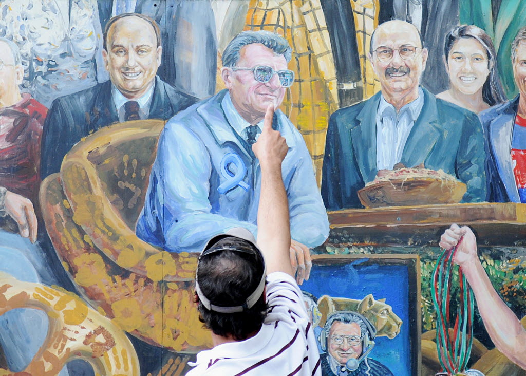 A visitor points to the spot in a mural by Michael Pilato where a halo that was above the late Penn State football coach Joe Paterno has been painted over by the artist in State College, Pa. on Saturday. Pilato had put a halo over Paterno’s image after the beloved coach’s death in January, but said he felt he had to remove it Saturday after a report that Paterno, former university president Graham Spanier and others buried allegations of child sex-abuse against ex-assistant Jerry Sandusky. Paterno’s family denies the claim. (AP Photo/Centre Daily Times, Abby Drey)