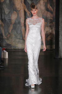 Like with color, gowns that showcase bold floral prints (e.g. Atelier Aimée’s cascading pink blossoms) are definitely for the unconventional, modern bride who wants to make a statement, says Hartwig. They are best suited for a tall, lean bride, so that the print doesn’t “swallow” her or put unwanted emphasis on fuller parts of the body.