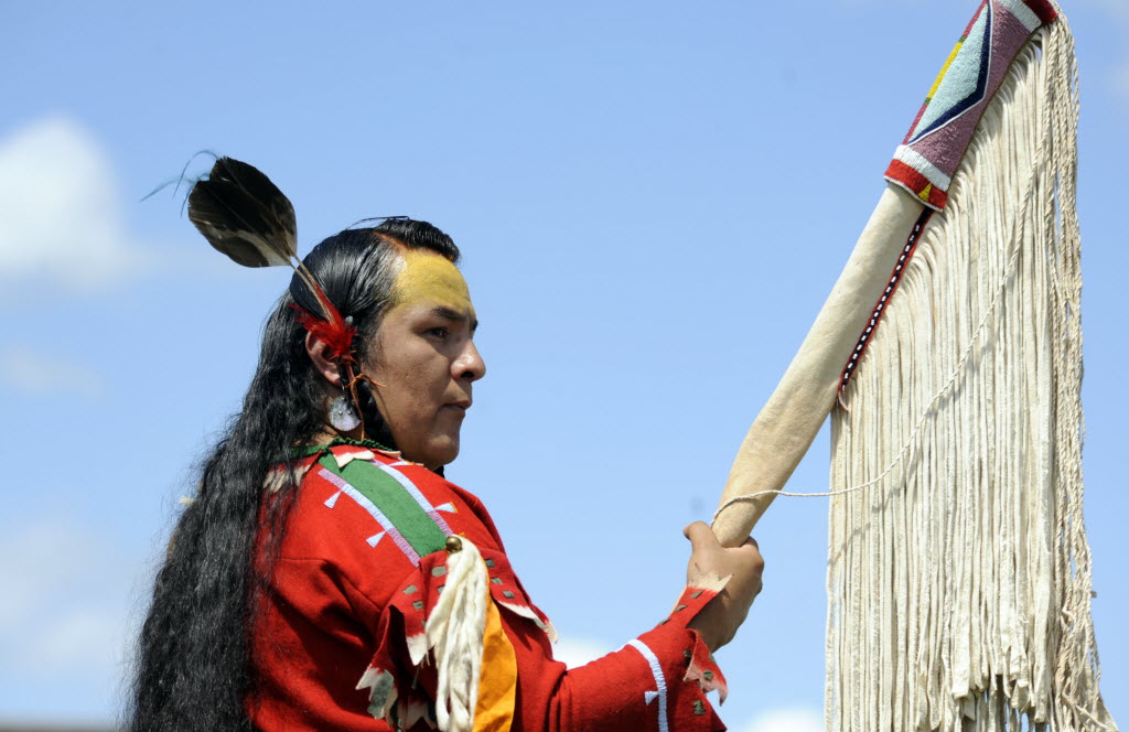 Nakia Williamson of Lapwai waits on his horse, Pisaqis, during the horse parade that precedes the entry of dancers into the arena Saturday at the Julyamsh Powwow at the Coeur d’Alene Greyhound Park. Williamson is a Nez Perce tribal member. The annual event attracted hundreds of dancers and many more spectators for the drumming and dancing, native art and handicrafts and many food booths. (Jesse Tinsley SR photo)