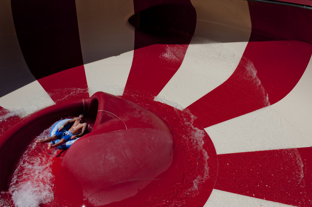 Bob Williams of Longview, Wash rides a body bowl slide on Monday, July 23, 2012, at Splashdown water park in Spokane Valley. Williams said he and his son, Bob Jr. travel to the park from the west side of the state as much as they can. (Tyler Tjomsland SR photo)