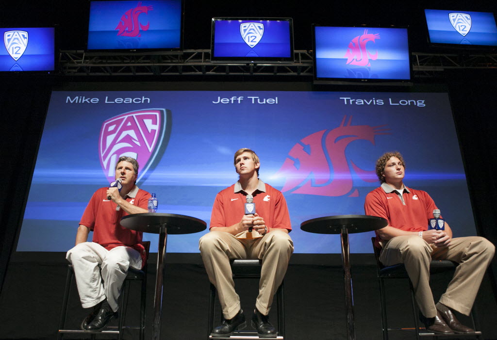 Washington State head coach Mike Leach, left, quarterback Jeff Tuel, center, and defensive end Travis Long take question at the Pac-12 college football media day in Los Angeles Tuesday. See story below. (AP Photo/Damian Dovarganes)