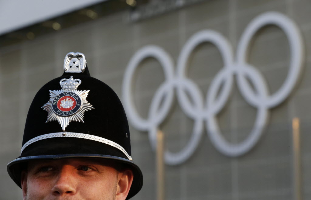 A police officer stands guard outside the Aquatics Center at Olympic Park before the 2012 Summer Olympics Wednesday in London. (AP Photo/Patrick Semansky)
