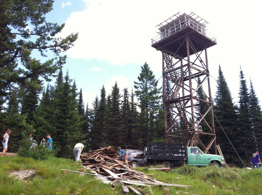 Volunteers begin refurbishing a national forest fire lookout on Spyglass Peak in the upper reaches of the North Fork Coeur d’Alene River in July 2012. The Idaho Panhandle National Forests partnered with Lutherhaven Ministries and the Forest Fire Lookout Association to renovate three historic structures, including Spyglass lookout tower, a ground house where workers who staffed the lookout lived when the lookout was operational, and an outhouse. Rich Landers SR story here. (U.S. Forest Service photo)
