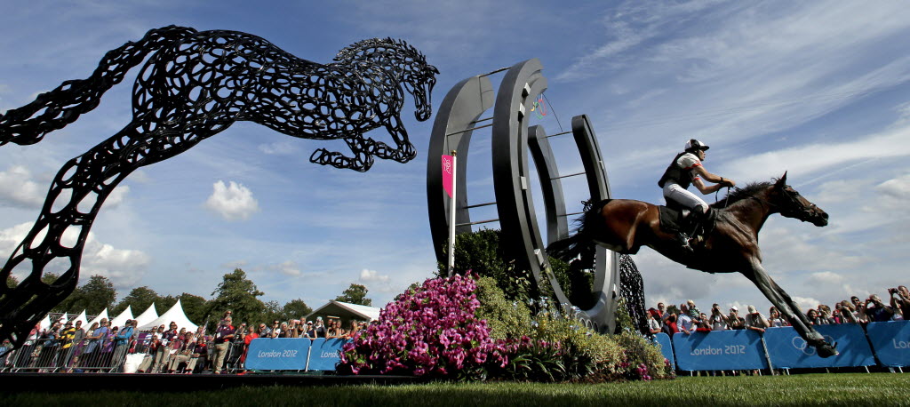 Aliaksandr Faminou, of Belarus, rides his horse Coolroy Piter as he competes in the equestrian eventing cross-country stage at the 2012 Summer Olympics today in London. (AP Photo/Charlie Riedel)