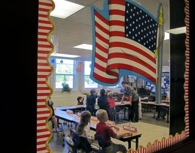 An American flag decorates the door of the first-grade classroom at North Valley Academy in Gooding. The K-12th grade public charter school is the first in Idaho to advertise itself as a patriotic choice for parents, with an emphasis on individual freedoms and free-market capitalism. A second patriotic-themed charter school has been proposed in Idaho Falls. (AP Photo/Jessie L. Bonner)
