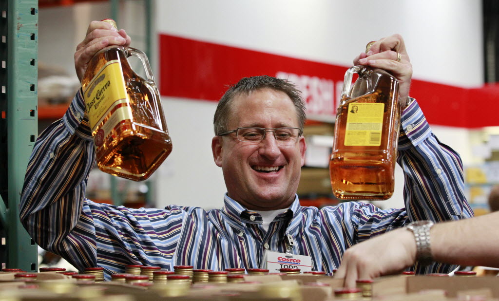 Store manager Todd Young smiles as he restocks at a Costco warehouse store today in Seattle. Private retailers begin selling spirits for the first time Friday under a voter-approved initiative kicking the state out of the liquor business. The initiative allows stores larger than 10,000 square feet and some smaller stores to sell hard alcohol.(AP Photo/Elaine Thompson)