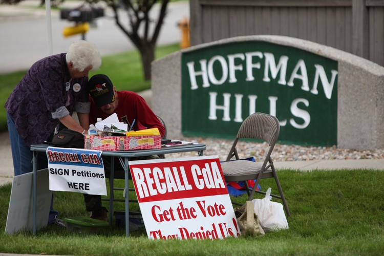 Robert Allen signs the ReCall petition while Carroll Carey, a ReCallCDA volunteer, looks on. The location was between 15th and 4th Street on Margaret Avenue in Coeur d’Alene. (Phantom Photographer photo)