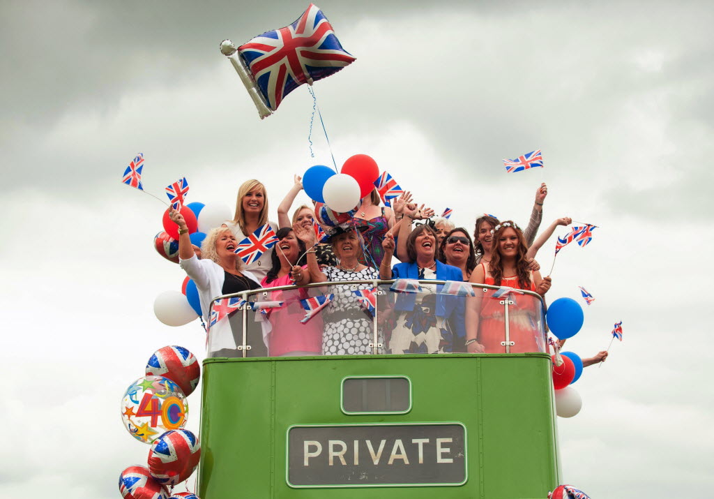 Racegoers on an open top bus during Investec Ladies’ Day of the Investec Derby Festival at Epsom Racecourse, Epson, southern England, earlier today. Queen Elizabeth II kicks off a long weekend of celebrations of her 60-year reign by going to the races, and perhaps no other event will give her so much pleasure. The Epsom Derby is the richest event on Britain’s horse-racing calendar, and never mind that this is the only major race in which the queen has never entered a winner. Pleasure, in the gilded life of Queen Elizabeth II, often comes on four hooves. (AP Photo/Dominic Lipinski/PA Wire)