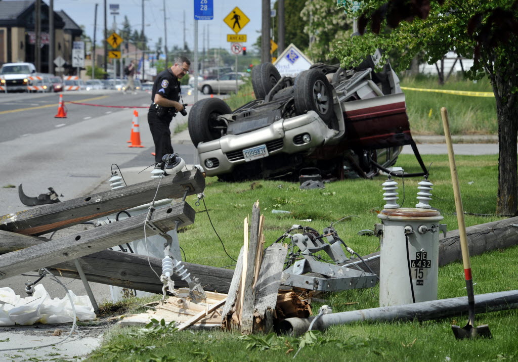 Spokane police gather information at the scene of a single car accident earlier today at the corner of Cataldo and Hamilton. The female driver lost control of her Mitsubishi Montero in the northbound land and sheared an utility pole. Emergency crews were delayed in extricating the driver because of downed power lines. She was taken to the hospital with non-life threating injuries. (Dan Pelle SR photo)