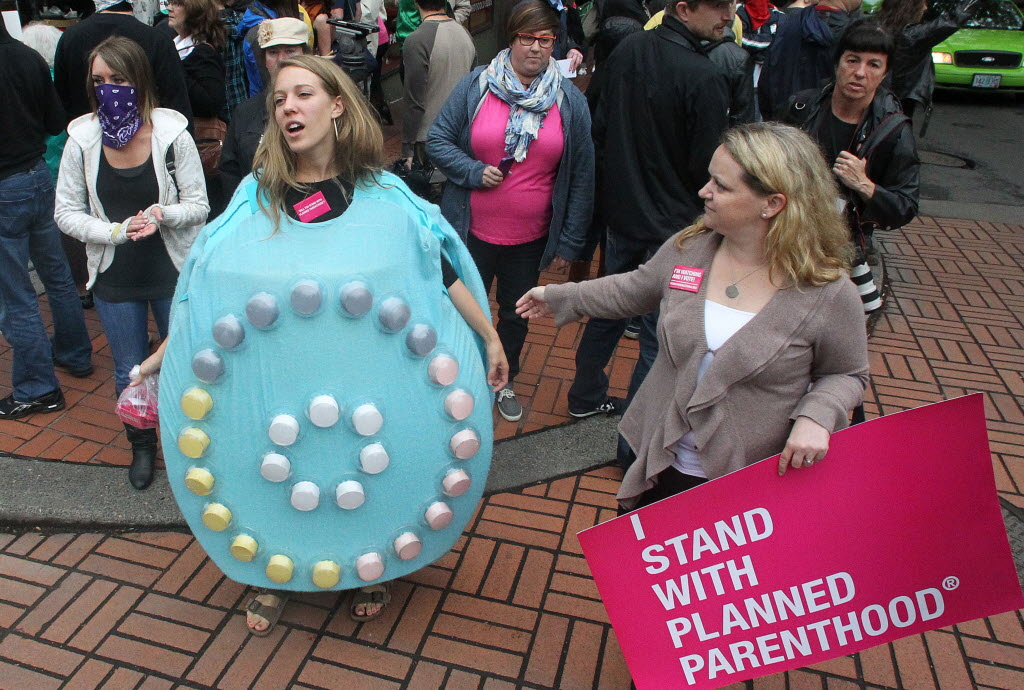 Planned Parenthood Advocate Rachael Munkacsi, left, protests during Republican presidential candidate, former Massachusetts Gov. Mitt Romney’s Oregon fundraiser earlier today in Portland, Ore. Romney made a brief stop in downtown Portland Monday for a fundraiser, but didn’t make any public appearances. (AP Photo/Rick Bowmer)