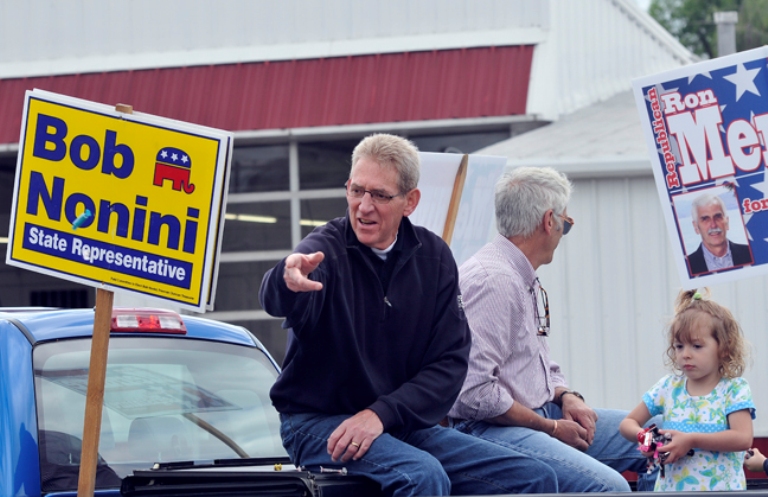 State Rep. Bob Nonini, R-Coeur d’Alene, and GOP nominee Ron Mendive work the Post Falls Days Parade route. Both were candidates supported by the hard right United Conservatives of North Idaho. Running unopposed Nonini advanced to a general election contest for the state Senate seat vacated by Sen. Jim Hammond. Mendive edged Reagan Republican-backed Jeff Tyler in a race for Nonini’s current House seat. (Jesse Tinsley SR photo)