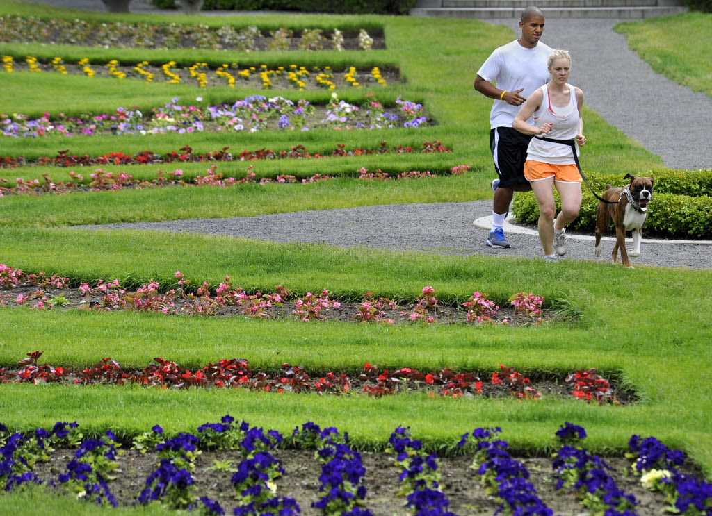 Katee Nauert, 25, and her fiancee, Alejandro Ventura, 32, along with their dog, Pedro, 2, run part of their 3-mile trek through the Duncan Gardens in Manito Park on Monday. The garden was named after John Duncan, who was the City Parks Superintendent. He retired in 1942. It was orginally called the sunken gardens because the site was lowered from removing the rich topsoil for use in other parks. (Dan Pelle SR photo)