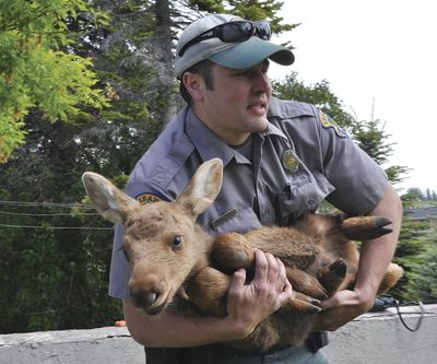 In this recent photo, Idaho Fish and Game officer Andrew Sorensen carries a baby moose to a waiting vehicle after it became separated from its family in Rexburg. (AP Photo/Rexburg Standard Journal, Joseph Law)