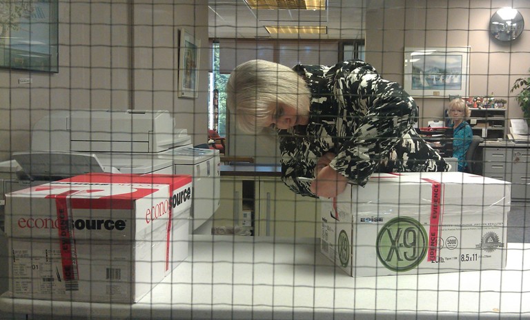 City Clerk Susan Weathers cuts the tape on one of the boxes of petitions turned in this morning by Frank Orzell and Bill McCrory of the RecallCDA group, who were accompanied by Coeur d’Alene attorney Glen Walker. (Phantom Photographer photo)