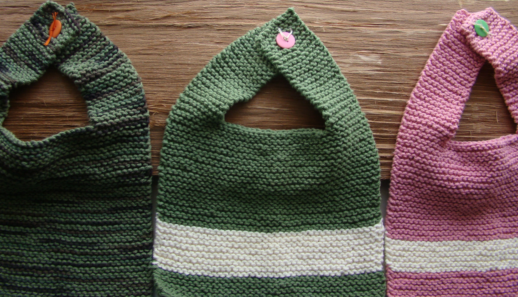 I have adapted the pattern for the bibs a bit, and have made them for several friends. I love knitting baby gifts that are both cute and serve a practical purpose—bibs are perfect, they don’t take long and they are versatile—any color(s) you dream of will fit the project.
