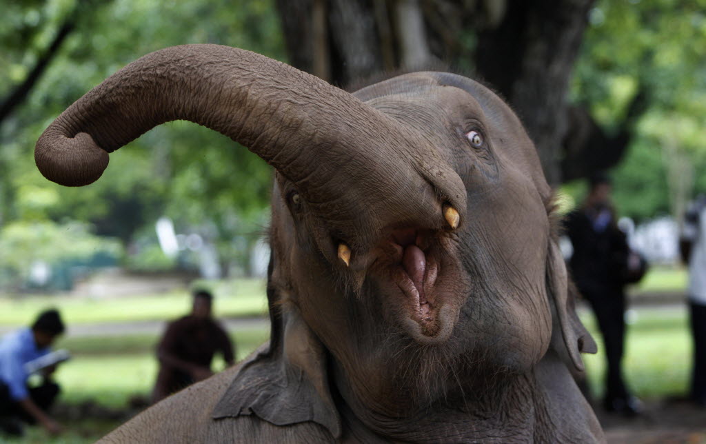 Seven-year old female elephant Ganga who belongs to a Buddhist temple plays in a park in Colombo, Sri Lanka earlier today. Tamed elephants traditionally have an important role in the island’s Buddhist customs and are considered a status symbol. Colorfully decorated elephants are used to carry sacred relics in annual Buddhist processions. (AP Photo/Gemunu Amarasinghe)