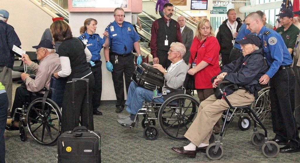 Some of the 97 WWII veterans from Montana are taken to the check-in area prior to their flight to Washington D.C. to tour the war monuments, at Billings Logan International Airport earlier today in Billings, Mont. The two-day whirlwind tour will feature a visit to the National World War II Memorial, along with the Lincoln, Vietnam and Korean memorials and Arlington National Cemetery. (AP Photo/Billings Gazette, Bob Zellar)
