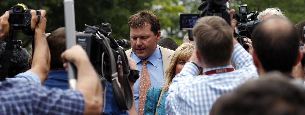Former Major League Baseball pitcher Roger Clemens, center, is surrounded by media as leaves federal court with his wife Debbie Clemens, right, and others Monday in Washington after his acquittal on charges of lying to Congress in 2008 when he denied ever using performance-enhancing drugs. More here. (AP Photo/Alex Brandon)