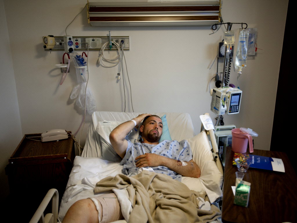 Jesse Johnson scratches his head as he lies with a bandaged thigh in a hospital bed on Monday at Providence Sacred Heart Medical Center in Spokane. (SRphoto/Tyler Tjomsland)