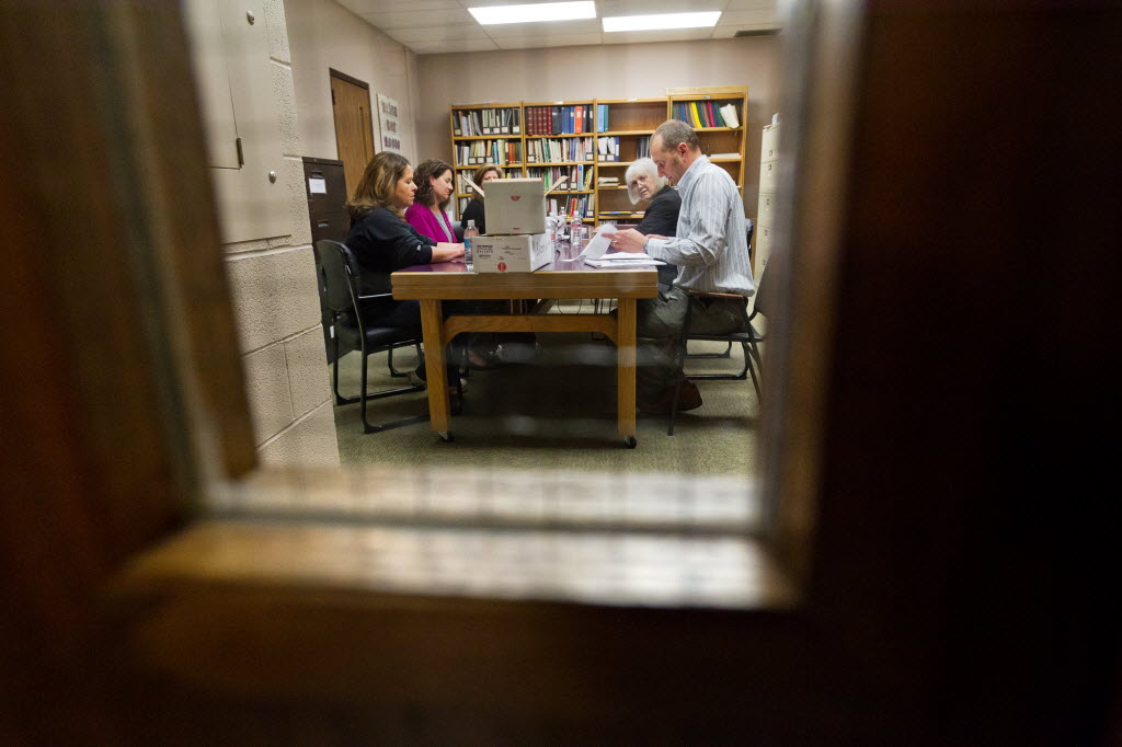 City of Coeur d’Alene staff count the number of certified signatures on recall petitions behind closed doors Monday at city hall in Coeur d’Aene. The ecall campaign targeting the mayor and three city council members in Coeur d’Alene has failed. Kootenai County election officials ruled Monday that recall organizers failed to collect enough signatures to trigger a recall election. Tom Hasslinger’s Coeur d’Alene Press story here. (Shawn Gust Coeur D?Alene Press photo)
