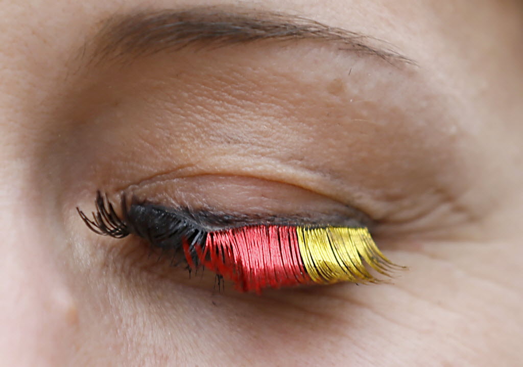 A German soccer supporter sports eyelashes painted in the colors of the national flag prior to the Euro 2012 soccer championship quarterfinal match between Germany and Greece in Gdansk, Poland, earlier today. (AP Photo/Frank Augstein)