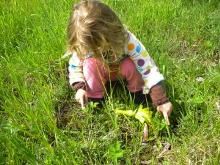 Keira searched for flowers in a tall patch of unmown grass in my backyard. Most of the grasses were just over