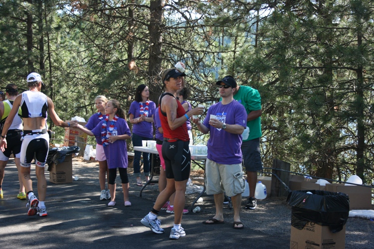 Coeur d’Alene resident, Jennifer Cowper, 42, stops to dump water on her head as she runs through Run Aid Station #6. This was Cowper’s first Ironman. Cowper received news covereage for her Ironman inspiration that came from her mother who was diagnosed with ALS disease. You can view the coverage here . Her official time was 12:51:13. (Christa Hazel photo special to Huckleberries Online)