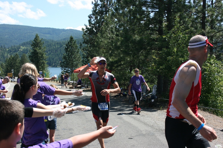 Coeur d’Alene business owner, Graham Christensen, 39, douses himself with water as he runs up Bennett Bay Hill heading west towards town. His official time was 10:18:55 and he ranked the top local finisher in Ironman. (Christa Hazel photo special to Huckleberries Online)