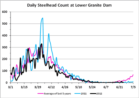 Next stop for many of those fish is the Snake River, where a few fish already are trickling over Lower Granite Dam — the last dam before they enter the Lewiston area, including the mouth of the Clearwater and the Grande Ronde River. The black line on the Lower Granite fish count should start going up any day.