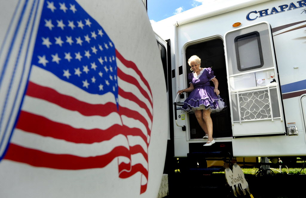 “You meet a lot of friends,” said Marty Golden of Wichita, Kansas as she showed off one of her dresses at the Spokane Fairgrounds on Wednesday. Marty is in town this weekend for the 61st National Square Dance Convention at the Spokane Convention Center & INB Performing Arts Center June 27-30. Pia Hallenberg SR story here. (Kathy Plonka SR photo)