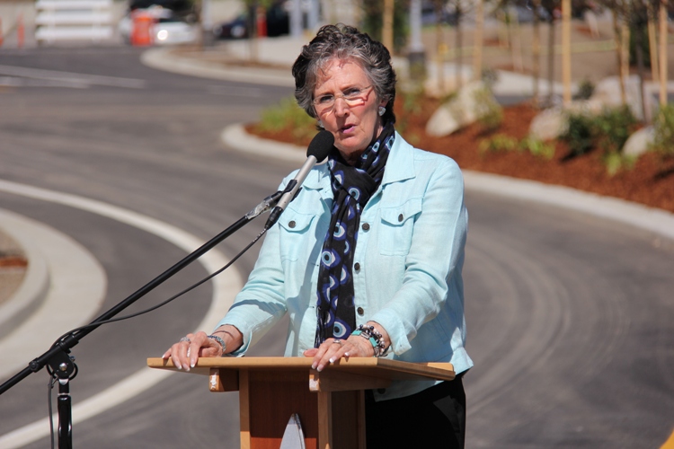 Coeur d’Alene Mayor Sandi Bloem addresses small crowd on hand for the dedication of Phase 1B (infrastructure) of future Education Corridor Wednesday afternoon at Military & River, north of North Idaho College. The project was a cooperative effort between NIC and the Lake City Development Corporation. Ribbon-cutting photograph here.