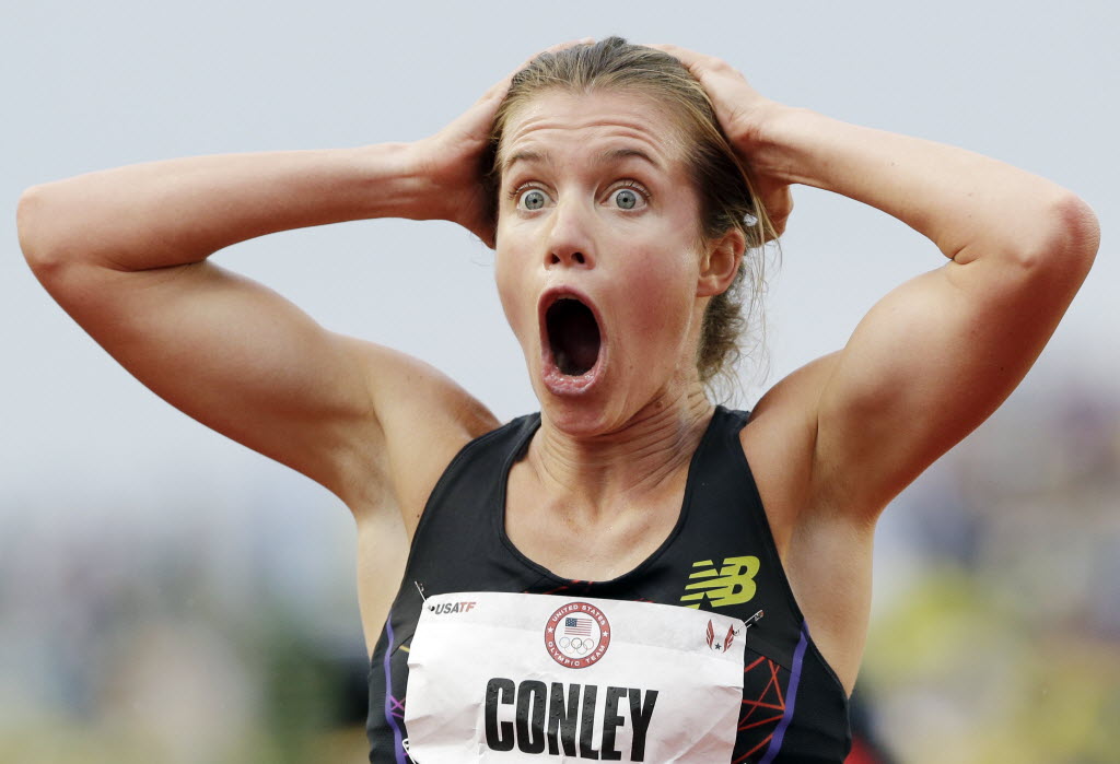 Kim Conley, reacts after seeing that her last second push against Julia Lucas won the third and final spot on the Olympic team in the women’s 5,000 meters at the U.S. Olympic Track and Field Trials Thursday in Eugene, Ore. (AP Photo/Eric Gay)’