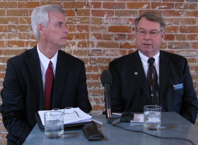 Idaho House Speaker Lawerence Denney, right, speaks to reporters at the Idaho Press Club on Tuesday; at left is Senate President Pro-Tem Brent Hill. (SR photo: Betsy Russell)