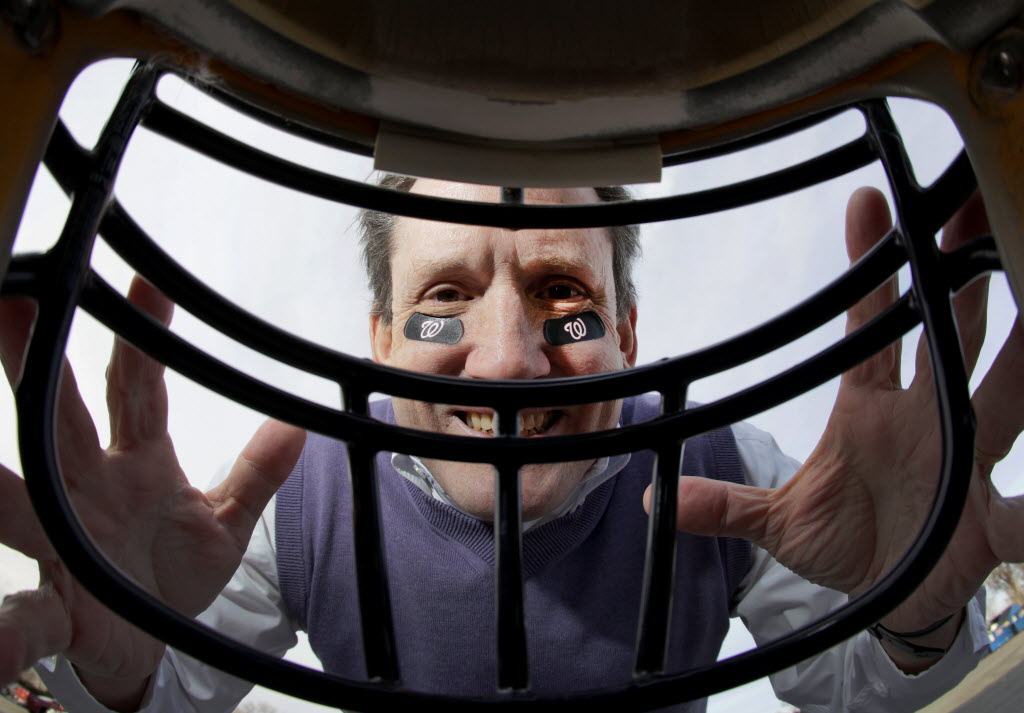 EyeBlack owner Peter Beveridge is seen posing outside of a football helmet while wearing EyeBlack patches in Rockville, Md. After starting the company in his mother’s basement, EyeBlack now has a license with Major League Baseball, has secured the services of a range of NFL players and has patches available with logos from more than 400 collegiate programs around the country. The company sold more than six million patches last year. (AP Photo/Patrick Semansky)