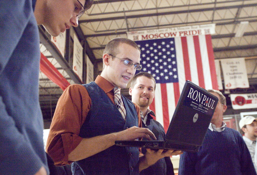Left to right: Jordan Kizer, Thaddaeus Hurley and Pete Nyhus look over data during Idaho’s first Republican presidential caucus Tuesday in Moscow. Ron Paul won the Latah County caucus vote with 52.2 percent of the vote, on the first ballot, but Mitt Romney carried the state in a landslide. (AP Photo/Moscow-Pullman Daily News, Dean Hare)