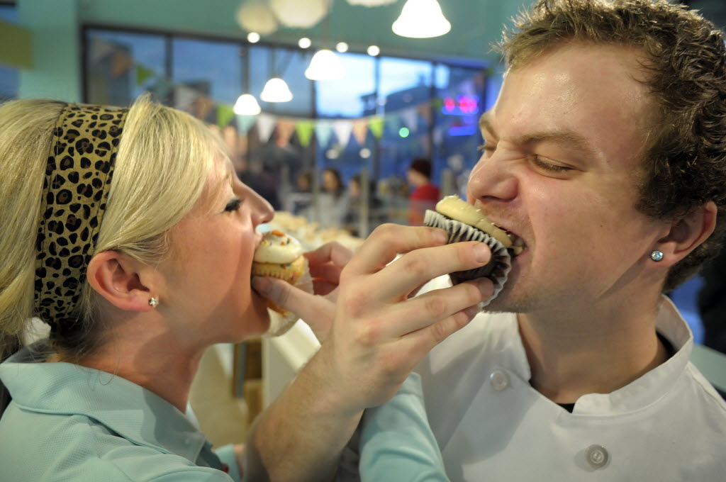 Layne Pavey, left, and Aaron Colby enjoy the perks of working in a bakery as they sample a couple of cupcakes at Sweet Frostings Blissful Bakeshop in Spokane. (January 2012 SR file photo Christoher Anderson)