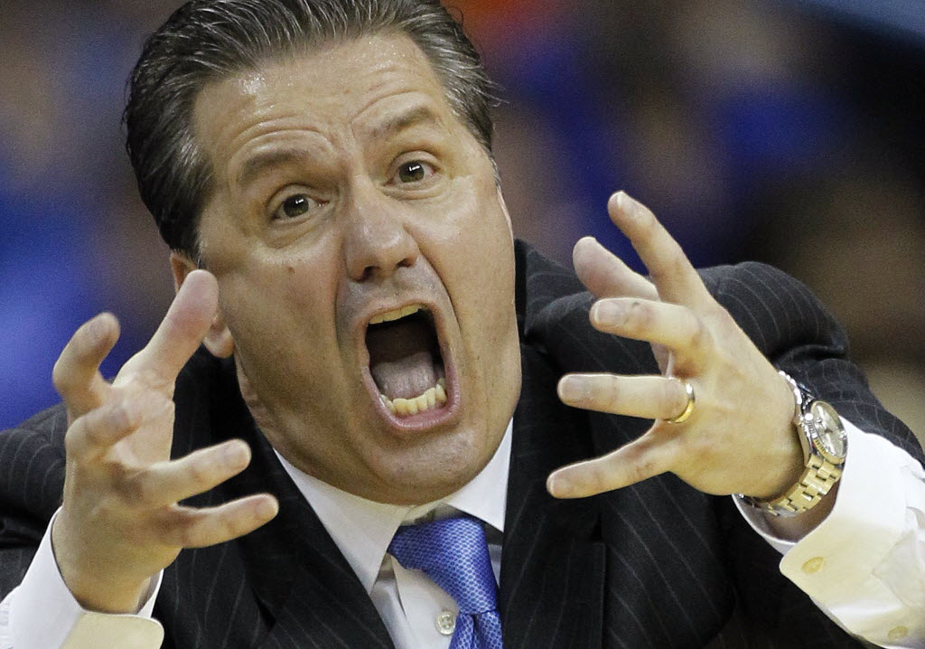Kentucky head coach John Calipari yells during the first half of an NCAA college basketball game against LSU at New Orlean today. You write the cutline. (AP Photo/Bill Haber)