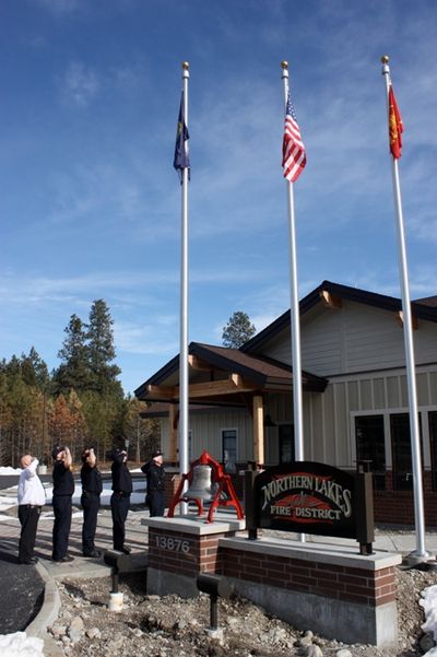 After years of planning, Northern Lakes Fire District’s new station 2 in Rathdrum is open for business as crews completed the move today. Saluting the flag that’s being raised for the first time were, from left: Deputy Chief Ralph Kramer, Chris Larsen, Mike Duke, Lt. Kevin Croffoot and Chris Kieres raising the flags for the first time. Story here. (Courtesy photo Northern Lakes Fire District)