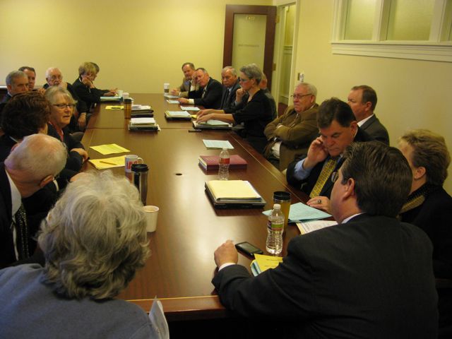 Members of the Joint Finance-Appropriations Committee discuss scheduled issues around next week's GOP presidential caucuses at their early-morning work session on Thursday. (Betsy Russell)