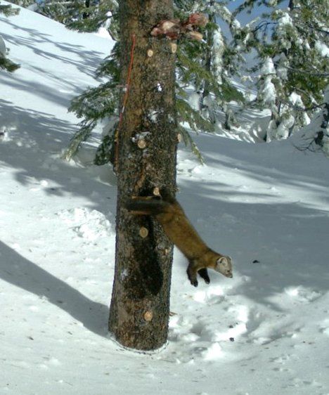 It’s easier to identify the marten, left, that provided this cool action image for a trail cam posted on a bait station at high elevations in the wolverine research project.