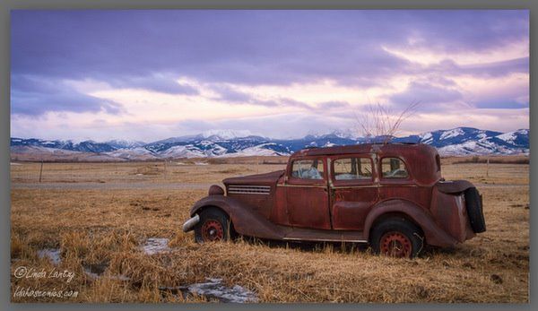 On her Facebook wall, Linda Lantzy of Idaho Scenic Images writes: ” I photographed this car last autumn but wasn’t happy with the result. Last Saturday at dawn the scene looked so much better against the snowcapped Tabacco Root Mountains (in southwest Montana).”