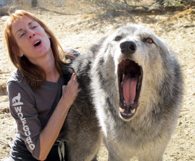 Lorin Linder, co-founder and president of the Lockwood Animal Rescue Center, is shown with one of the 29 rescued wolf dogs at the center in Lockwood, Calif. It’s been three months since this California animal rescue center retrieved 29 wolf dogs from an Alaska tourist attraction that had fought the state over owning, breeding and selling the wolf-hybrids. Chains were so deeply embedded in the necks of two of the animals that they had to be surgically removed.The task of taming the wolf-dogs has been given to a couple of U.S. military veterans who say they can relate to the stress of trying to transition to a normal life. (AP Photo/Nick Ut)