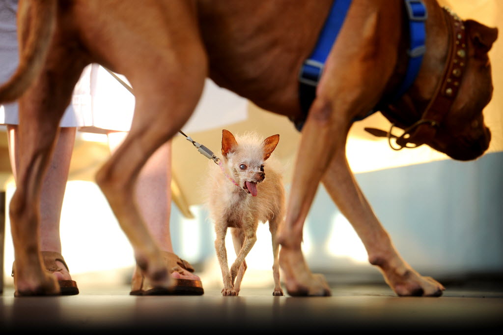 Yoda, the diminutive winner of the 2011 World’s Ugliest Dog Contest, squares off against a boxer named Pabst in Petaluma, Calif. Yoda took home $1000 and a plethora of pet perks after winning the Sonoma-Marin Fair competition. The 1.8-pound female Chinese crested-Chihuahua mix owned by Terry Schumacher of Hanford, died in her sleep Saturday. She was 15. (AP Photo/Noah Berger, File)