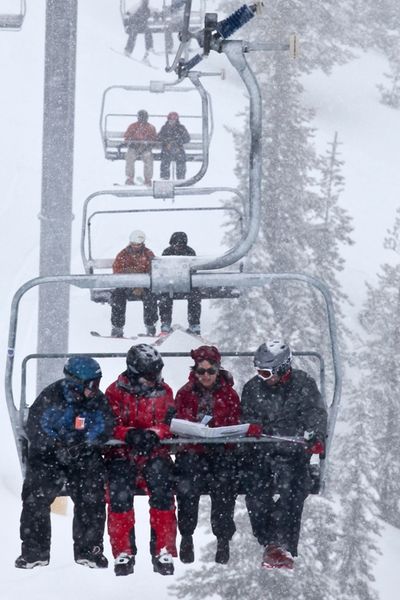 The great Sandpoint Chairlift Pitch Contest at Schweitzer Mountain Resort in Sandpoint today. Contestants rode a chairlift up to 6000 feet, pitching their start-up business to judges for prizes, all in an effort to grow emerging businesses in the outdoor and recreation industry in that community. Shown here (from left):