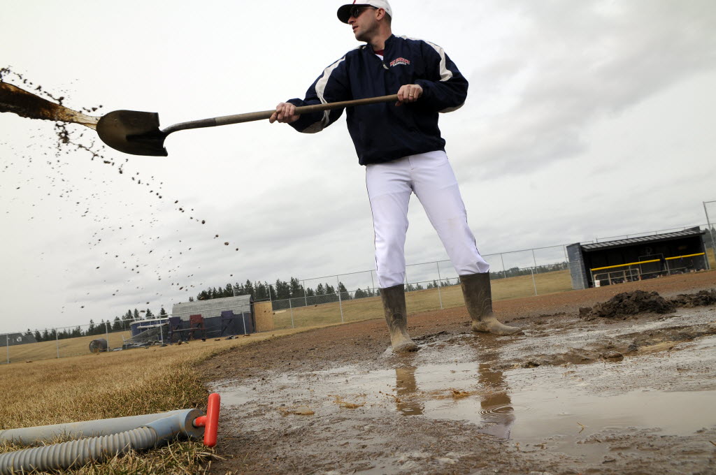 Spring baseball, Spokane style: Mt. Spokane High School baseball coach Alex Schuerman tries to shovel away the muddy slop between first and second base before practice at the school’s varsity field on Wednesday. The Wildcats are to open the season at home against Gonzaga Prep today, weather permitting. (SR photo: Dan Pelle)