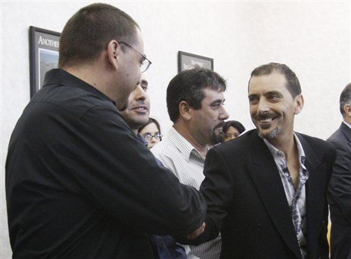 Top: Americo Lopes exits the courtroom on Wednesday in Elizabeth, N.J. A jury found that Lopes had cheated five co-workers out of their share of a $38.5 million lottery jackpot. Below: Plantiffs Carlos Fernandes, right, Candido Silva Jr. shake hands. (AP Photos/The Star-Ledger, Frances Micklow, Pool)