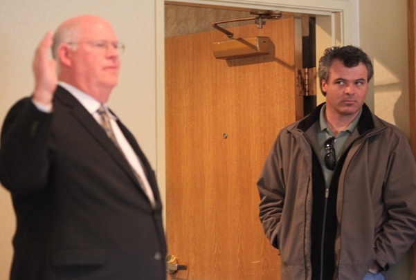 Larry Spencer, right, studies Don Gary, a Republican challenger to incumbent Prosecutor Barry McHugh, at the Panhandle Pachyderm Club luncheon in Post Falls today. Gary and McHugh debated during the lunch.