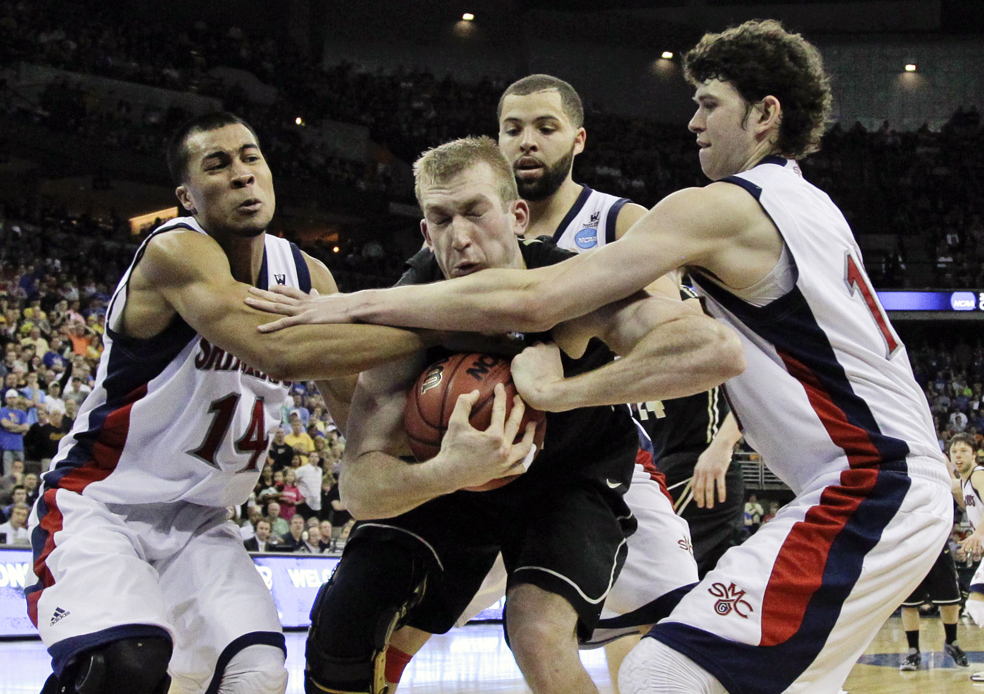 Purdue’s Robbie Hummel, center, is fouled by Saint Mary’s Stephen Holt (14), Jorden Page, right, and Rob Jones, rear, in the second half of an NCAA tournament second-round college basketball game at CenturyLink Center in Omaha, Neb., Friday. Purdue won 72-69. On Thursday, BYU lost, leaving the Gonzaga Bulldogs as the only WCC team and only team in the Pacific Time Zone left in the NCAA Tournament. (AP Photo/Nati Harnik)