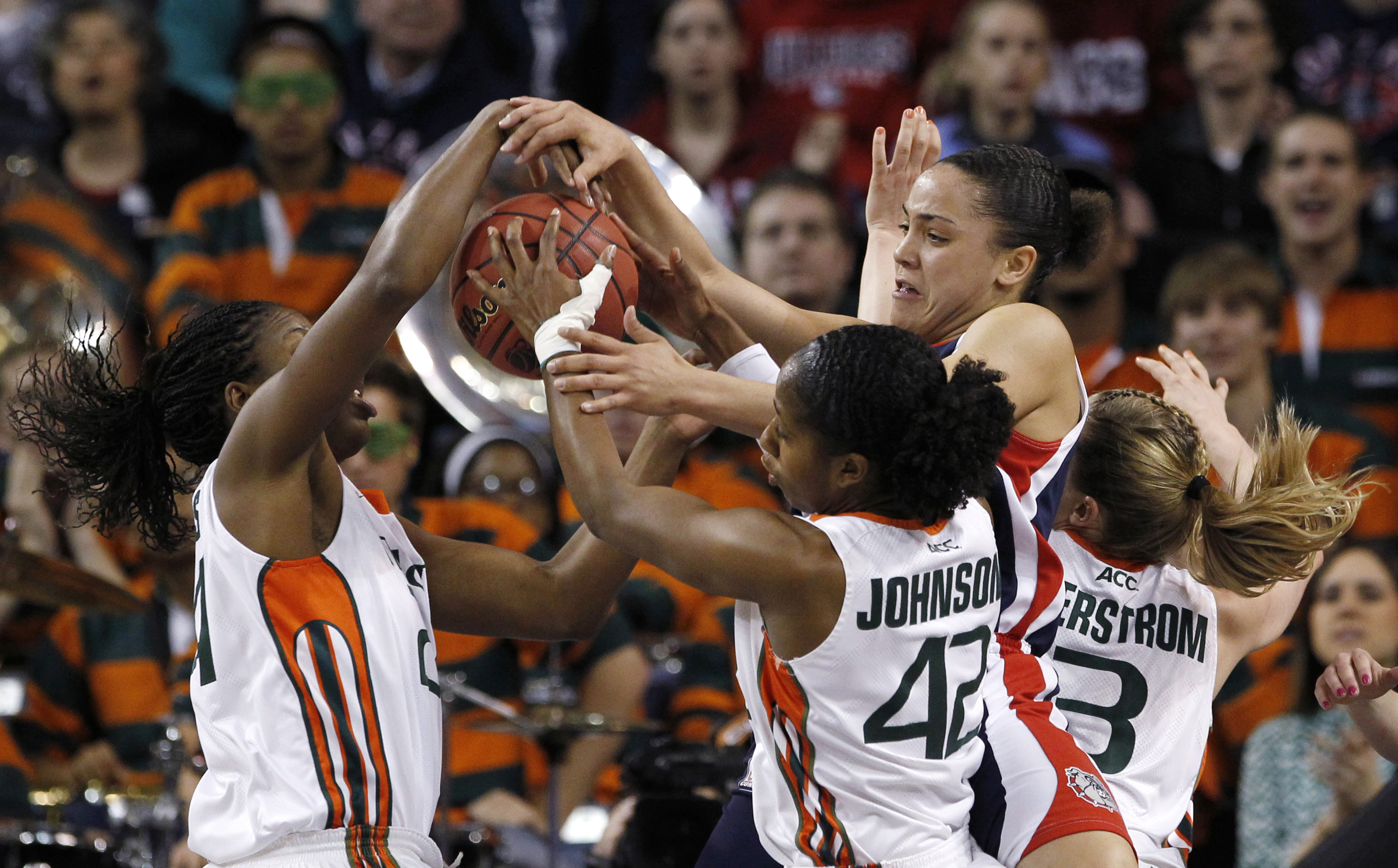 Gonzaga’s Haiden Palmer, second from right, competes with Miami’s Jessica Capers, left, Shenise Johnson and Stefanie Yderstrom for a loose ball in the first half of an NCAA tournament second-round women’s college basketball game in Spokane Monday. No. 11 seed Gonzaga upset the No. 3 seed Miami 65-54. Story here. (AP Photo/Elaine Thompson)